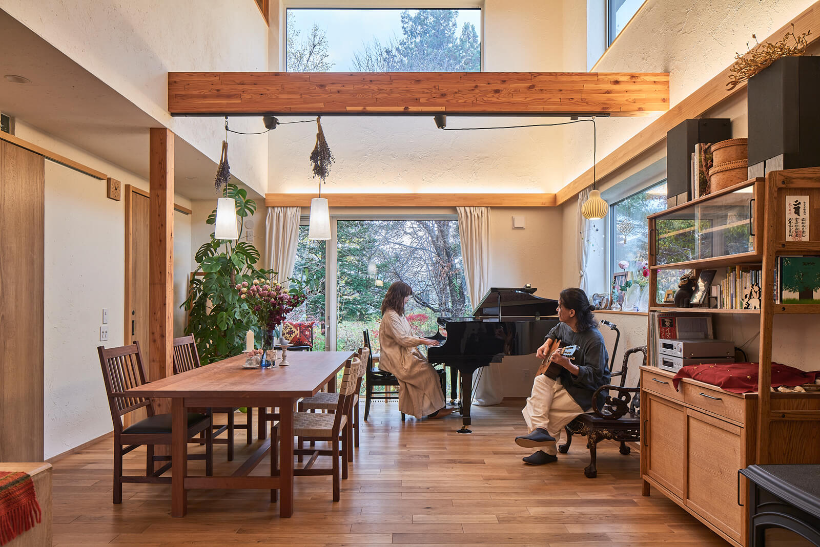 新居のコンセプトは「人が集う家」。自宅でありながらスタジオとしてピアノやボーカルのレッスンを行ったり、時にはミニコンサートもできる空間を希望。また将来的にはゲストハウスやカフェとしても使えるような設備も整えたい、と夢は膨らみます。この家で叶えたいことを伝え、間取りのイメージ図を描き、限られた予算の中でも見えない部分にもこだわり、打ち合わせを重ねて完成したのは、吹き抜けのリビングの窓から緑あふれる庭を望む開放的な家です。