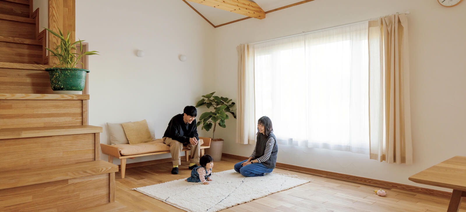 30年以上、旭川エリアの木造住宅を手がけてきた新濱建設は、道産木材をはじめとする自然素材を生かした高性能な住まいを、若い子育て世代でも手の届く予算で提案しています。「実際に新濱社長に会い、家づくりで目指す方向が同じだと感じて、ほかと比べることなくプランづくりをお願いしました。必要以上に背伸びをしなくてもいい予算感も安心でした」。