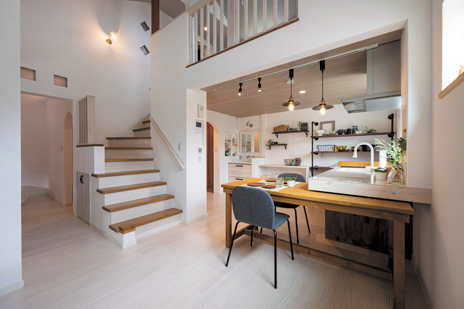 まず、漆喰壁に青い屋根、そしてサックスブルーのドアや格子窓が何ともかわいらしい外観に目を奪われます。車が3台停められる駐車スペースに手づくりの板塀やプレート、植栽もトータルでデザインされています。室内は、玄関を入って右手のLDKから水まわり、ウォークインクローゼットを通って寝室までぐるりと一周できる回廊型の間取りが特長。LDKはリビング部分が吹き抜けということもあり、面積以上の広がりが感じられます。