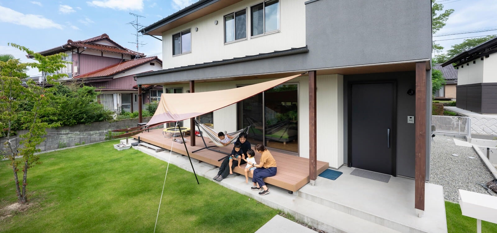 じっくりと時間をかけて打ち合わせを行う中で、いつしか三人家族から五人家族となったMさんご一家。「休日は家で過ごすことが増えました。窓が大きくて庭に出やすいので、夏は庭でテントを張ったり、バーベキューやプール遊びをしたりと、家族みんなで内と外を一体的に楽しんでいます」と笑顔を見せます。この日も家の中と庭を元気に走り回るお子さんたちの姿が印象的でした。