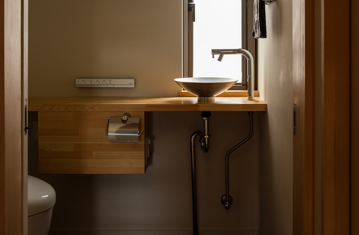 ただ手洗い器を単独で付けるには、ギリギリの広さ。カウンターの奥行きに合わせたコンパクトな手洗い器を組み合わせると無理がありません。