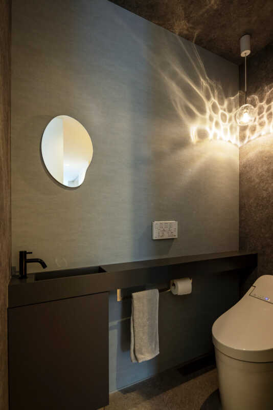 便器前のスペースが狭いため、できるだけ奥行きが浅くて出入り口に干渉しない手洗い器を選ぶ必要があります。カウンターの奥行きは100㎜程度が目安。壁に近い色にすると圧迫感が軽減できます。