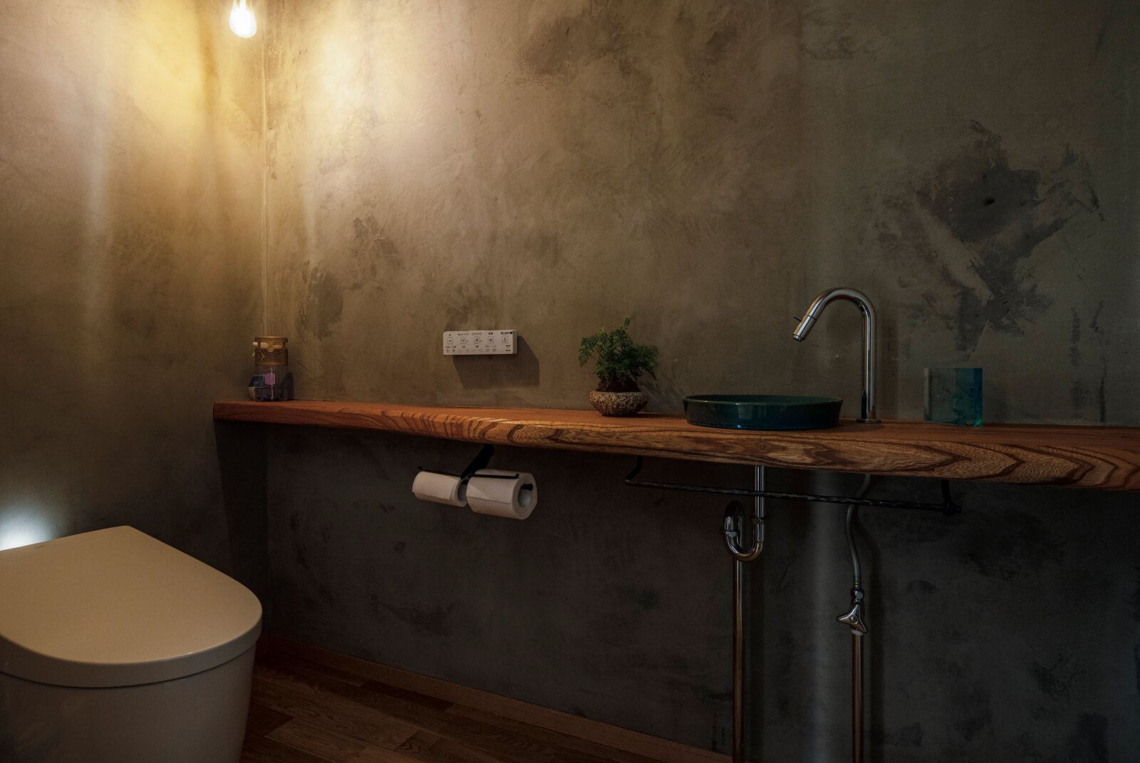 カウンター下にはペーパーホルダー、リモコン、収納などを組み合わせることができ、空間をすっきりと見せられるのも魅力です。