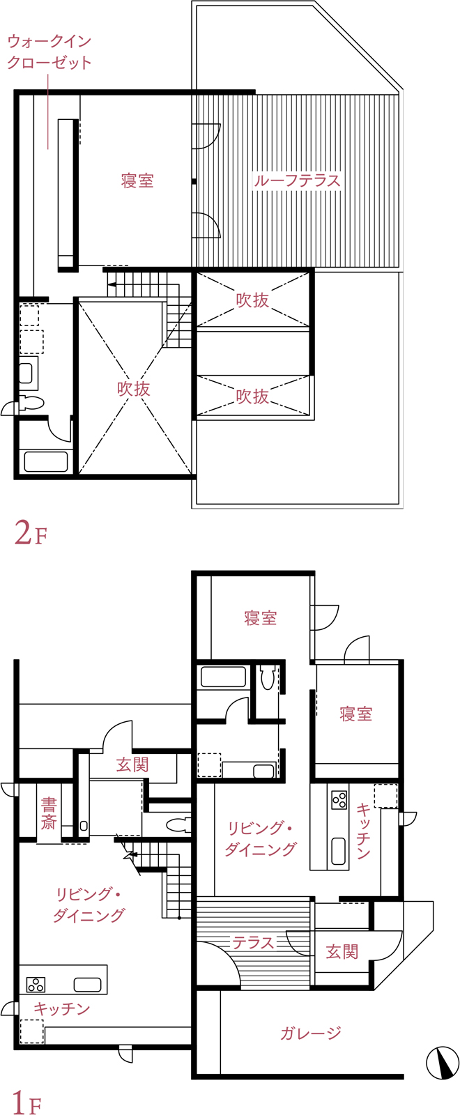 西棟は広めの玄関ポーチを備え、ワンちゃんとの共生・在宅ワークを想定して1階にLDKを配置しています。2階は水まわりとプライベートスペースで構成し、ドッグランにも活用できる広いルーフテラスからは角地の開けた景観を楽しめます。