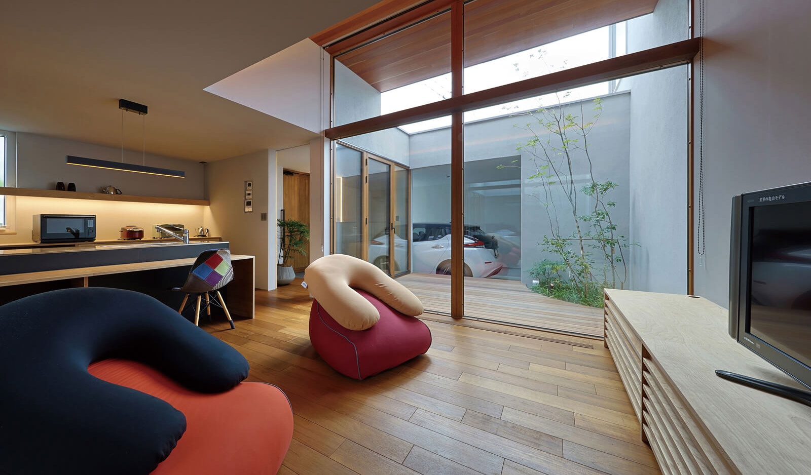 東棟はガレージを設け、玄関とテラスに直接アクセスできるようにデザインしました。いずれは事務所や賃貸にも転用できる想定です。角地には既存の樹木があり、それを生かして坪庭を配置。断熱材や造作材など新たな試みも垣間見える仕上げを意識し、暖冷房については壁掛けエアコン1台で全館空調となるシステムを構築しました。