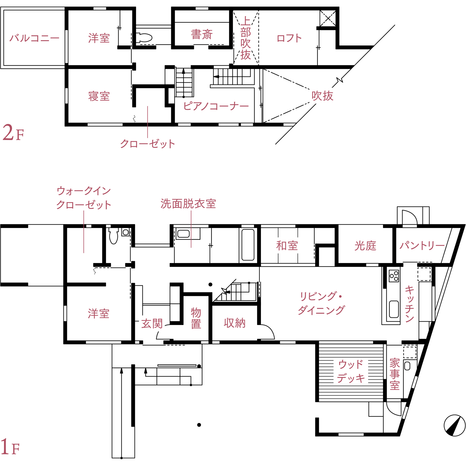 それらの要望を踏まえて、階段の踊り場と一体化させた中二階に奥様の趣味であるピアノのコーナーを配置。そこを中心として、家族4人が泊まれるロフト空間やはしご、バルコニーなど、さまざまな魅力ある居場所が大屋根の下に一体感を持ってつながる居住空間を創り出しました。