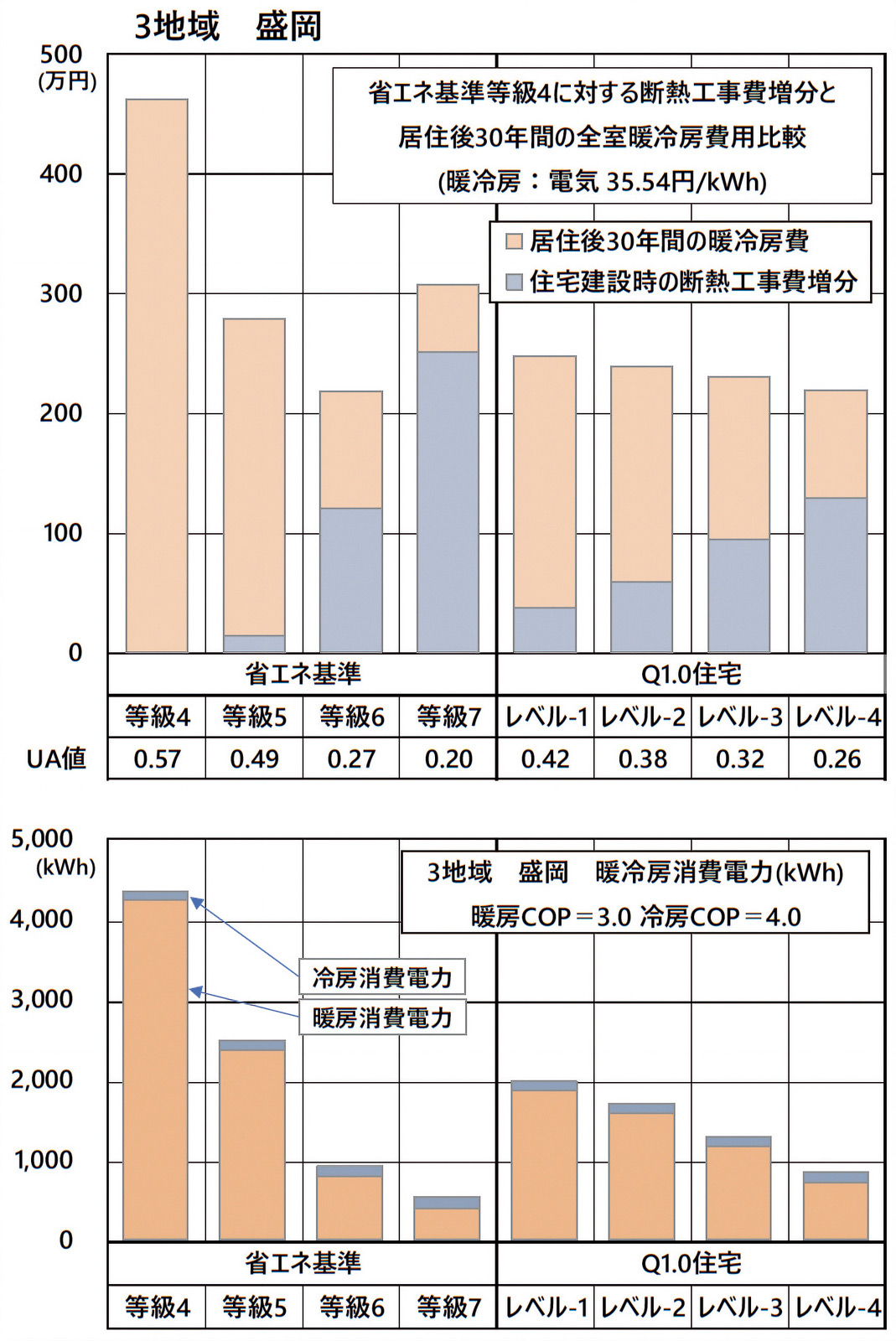 省エネ基準等級4に比べて高くなる工事費増分と、30年間の暖冷房費を加えて比較したグラフを掲載しています。図2ではそれに、等級5と6の住宅も加えて計算し直しました。