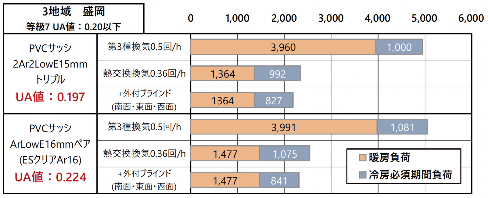 全国版のパンフレットのため、寒冷地の代表に盛岡のデータで示していますが、熱交換換気を使わないと暖房エネルギーは3倍にもなります。また盛岡では、日射を取り込むためトリプルガラスを使わずにペアガラスとすると、UA値は大きくなり等級7をクリアできなくなりますが、暖房エネルギーはほとんど変わらない住宅ができます。また、冷房負荷も日射遮蔽をきちんとすることで等級7の住宅とほとんど変わりません。こうして、開口部を大きくしてなおかつコストダウンも可能になる設計手法が存在するのです。