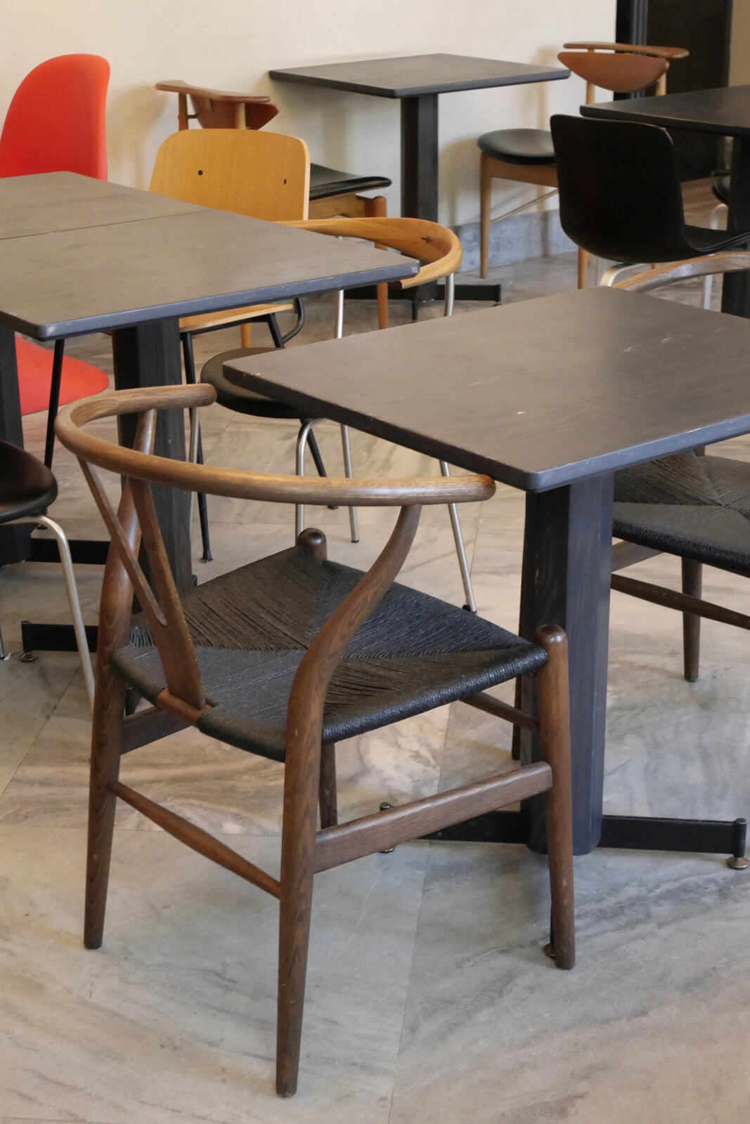 一通りの見学を終えたら、デザインミュージアムのカフェでひと休みしました。ここがまたとてもいい。テーブルごとにさまざまな名作チェアが置かれていて、座るのも見るのも楽しい空間です。「実はこれ、座って、食事をして、息抜きの中でデザインを楽しむ体験型の展示なのでは?」と疑うほどでした。