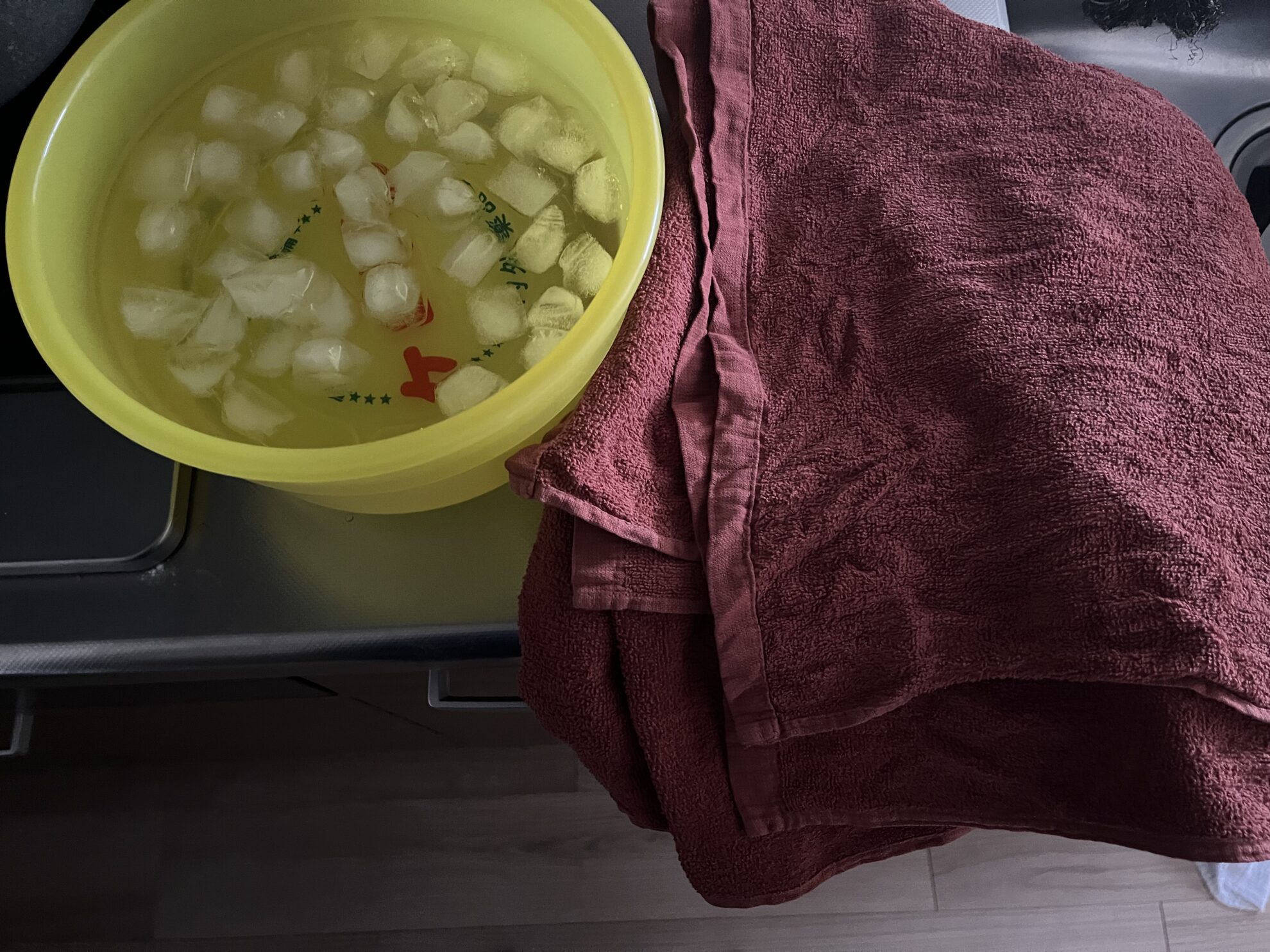 とりあえず手頃なサイズの洗面器に氷水を張って、タオルを用意し準備は完了。