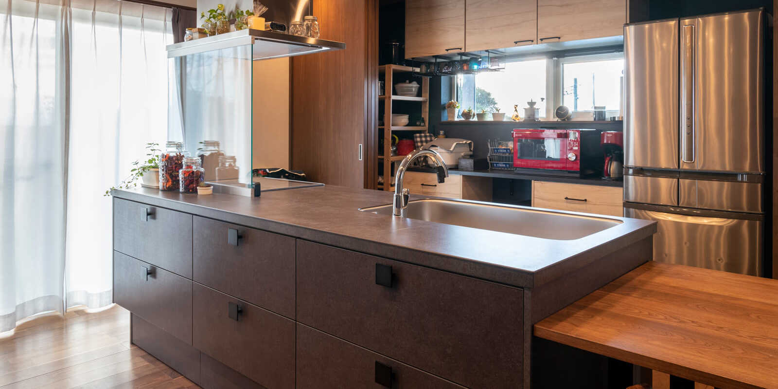 間取りや内装デザインは、奥さんが一目惚れしたキッチンを中心にプランニングしました。いわば「キッチンから始まる家づくり」です。どんな間取りにどうキッチンを配置すれば収まりがいいのか、どんな内装仕上げがデザイン的にマッチするのかを吟味し、結果、ブラックウォールナットの床や板張り天井がキッチンの雰囲気によく似合う、落ち着いたアーバンスタイルの空間に仕上がりました。