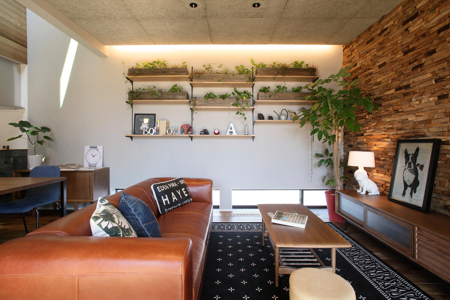 ヴィンテージテイストを採用した内装もまた、上質で心地よい暮らしを叶えてくれる一要素。アカシアの無垢床やレッドシダー羽目板張りの壁といった木の空間に、アイアンやタイルなどの異素材を加え、木毛セメント板仕上げの天井や荒々しいウッドタイル壁でラスティックな趣もミックスしました。カフェのようなスタイリッシュな佇まいが、心にゆとりをもたらしてくれます。