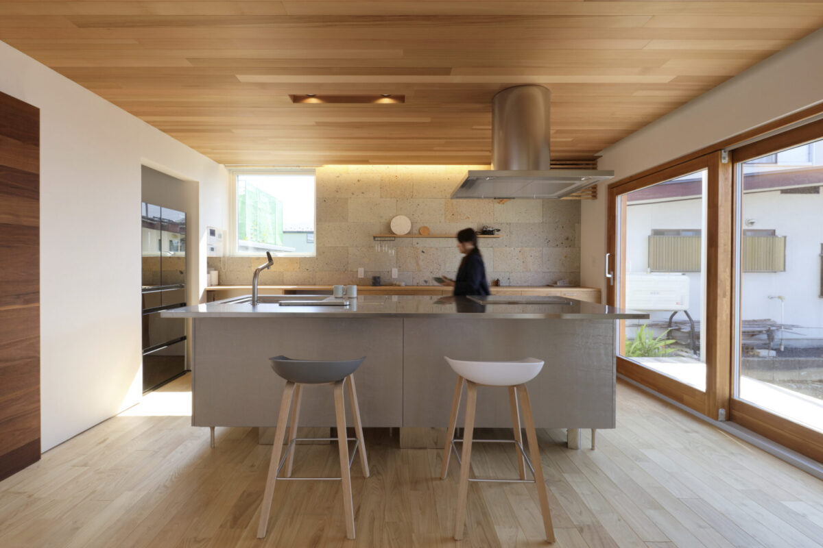 - ガレージハウス、コートハウス、バリアフリー、二世帯住宅、吹き抜け、回遊動線、平屋、店舗併用、薪ストーブ
