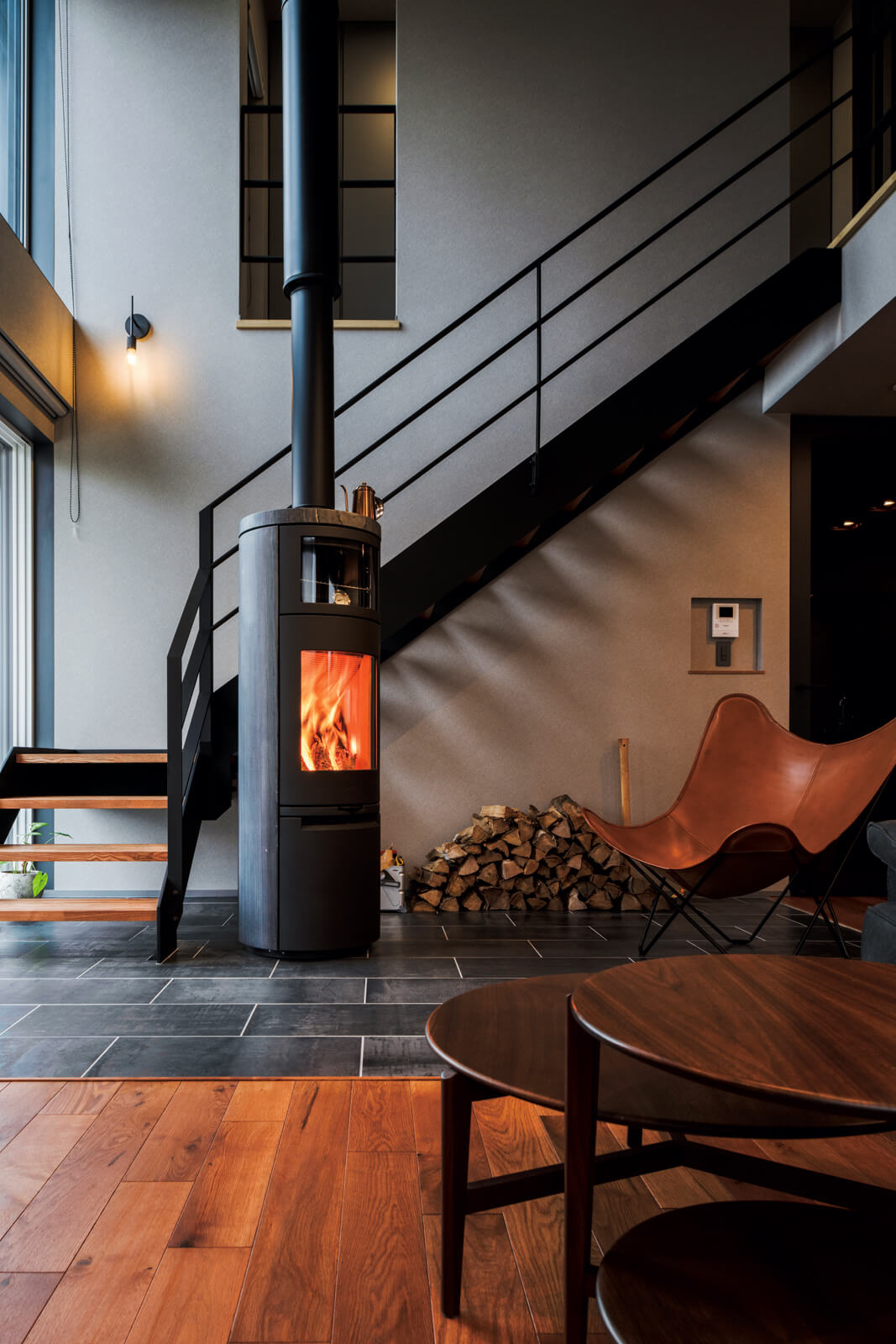 木とブラックのデザインを楽しむ、薪ストーブのある心地よい家