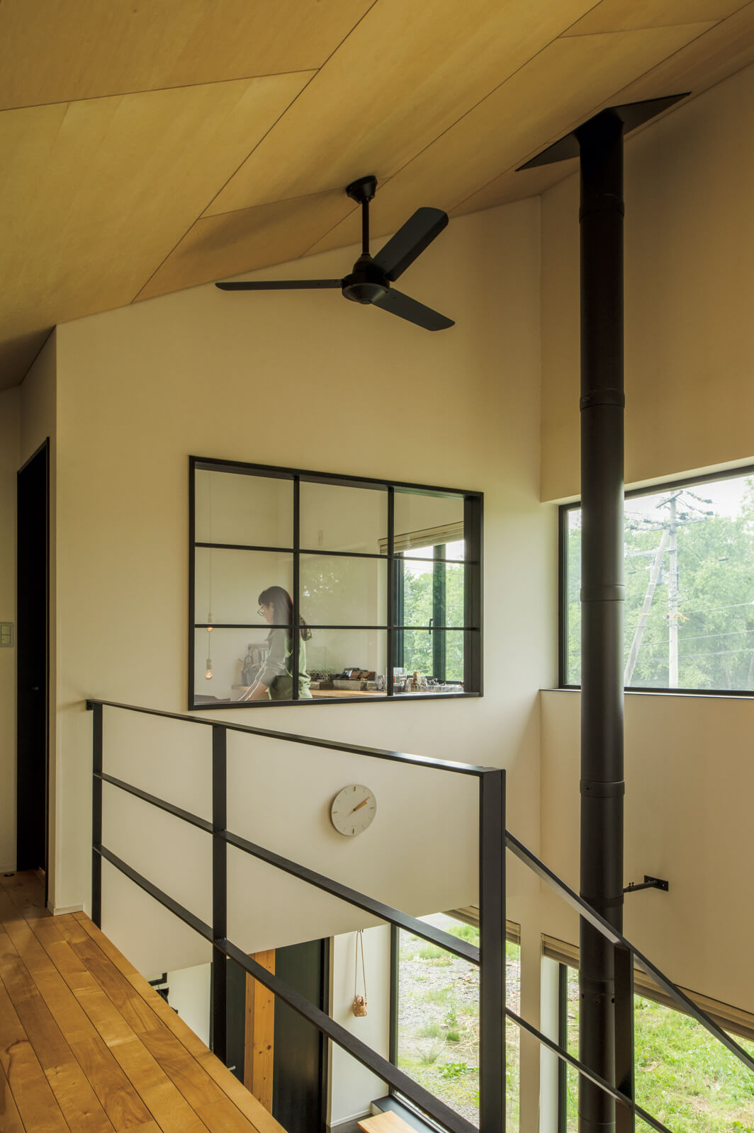 アパート暮らしを経て、故郷の東川町へ帰郷したご夫妻は、幼少期から憧れていた薪ストーブのある暮らしを叶えるため、薪ストーブの豊富な施工実績のあるアーケンをパートナーに選びました。住まいの核となるのは、どこからでも美しい炎を眺められる円筒形の薪ストーブ・ワム「3630」です。薪の搬入動線に配慮して玄関土間に設置し、吹き抜けを介して家全体を効率よく暖める設計としました。LDKのどこからでも揺らめく火を眺める時間は、ご家族にとって何物にも代えがたい至福のひとときです。