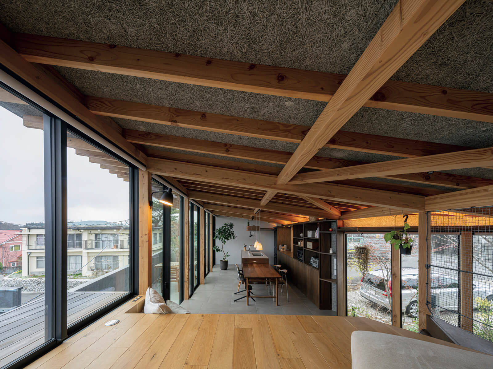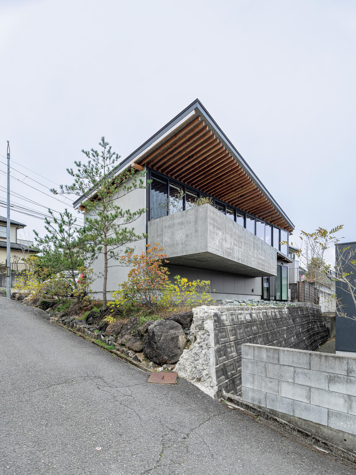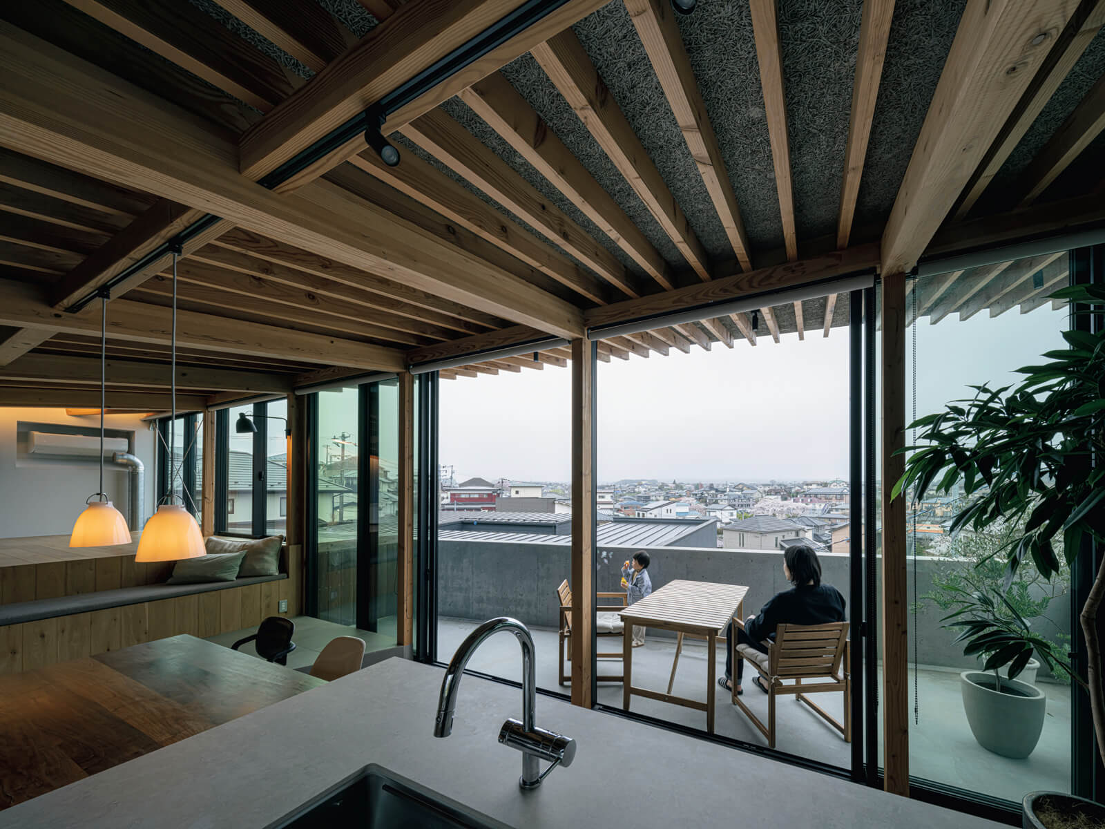 「ワクワクする家を」との願いから生まれたのは、高台の眺望を楽しみながら暮らせる平屋です。敷地の高低差を生かしたスキップフロアにより、約24坪というコンパクトさからは想像できないほど伸びやかな空間が広がります。家の中心にあるらせん階段が、パノラマを堪能できるLDKとワークスペースや寝室などの静かな個室群を緩やかにゾーニング。バルコニーやLDKで刻一刻と変わる空を眺める時間は、ご夫妻にとってかけがえのない日常となりました。丹精込めて手入れする庭の緑も、暮らしに豊かな彩りを添えています。