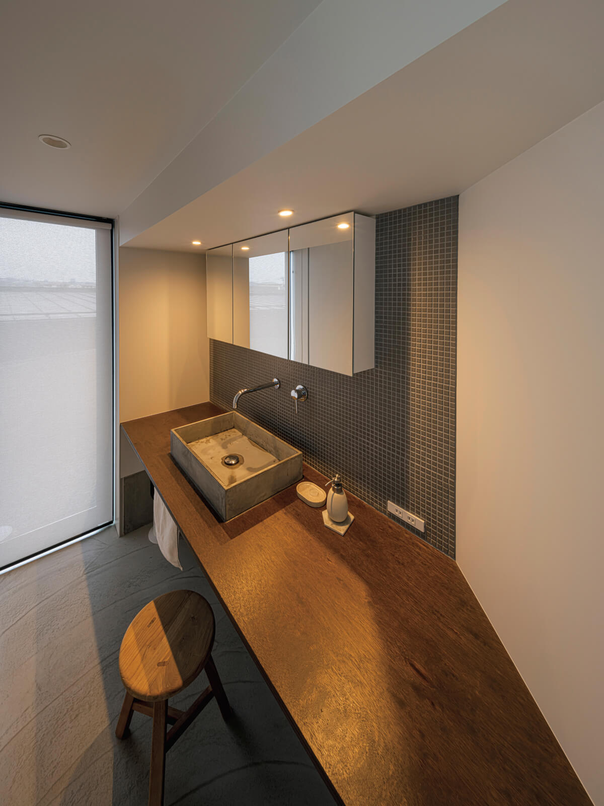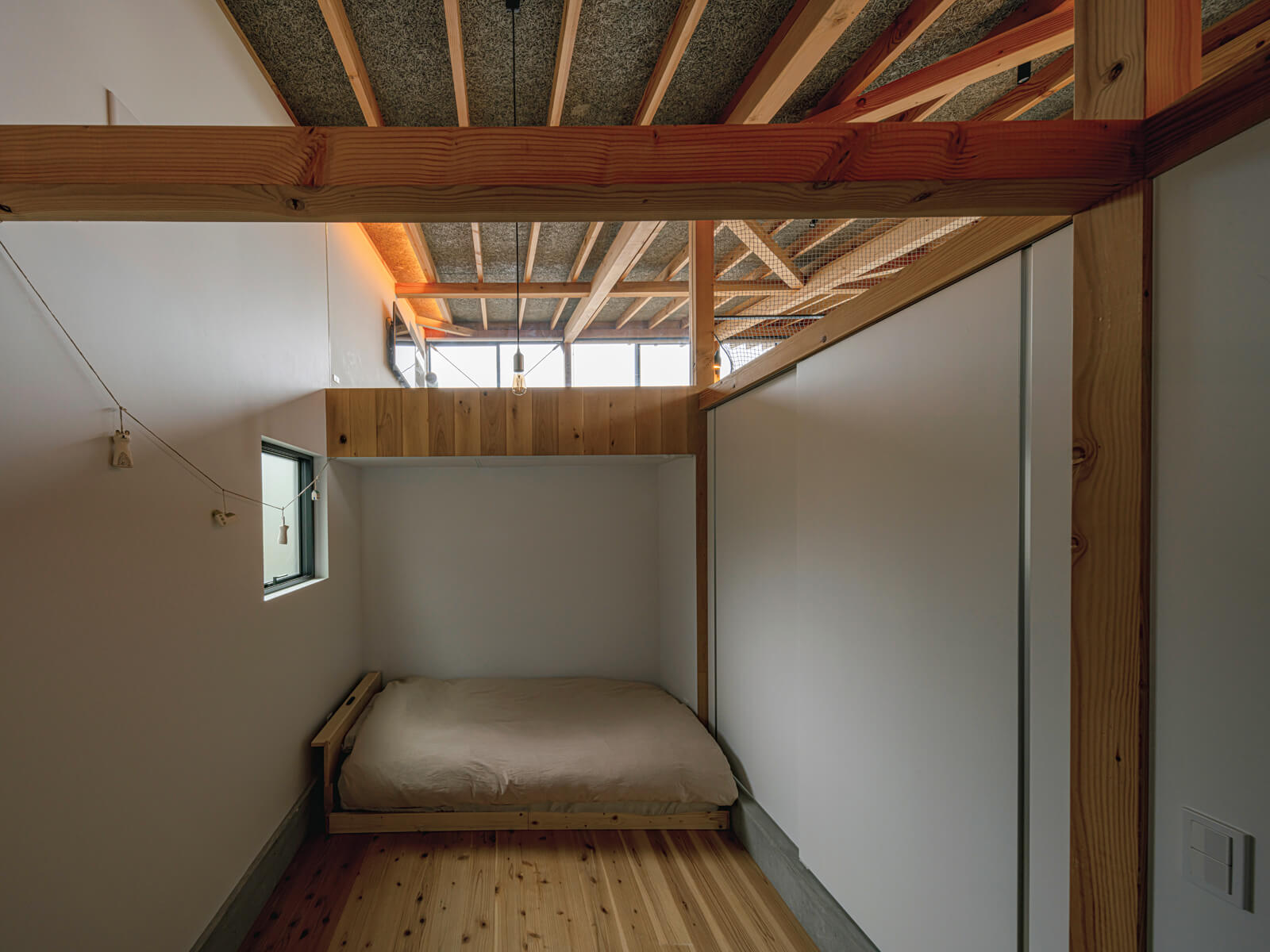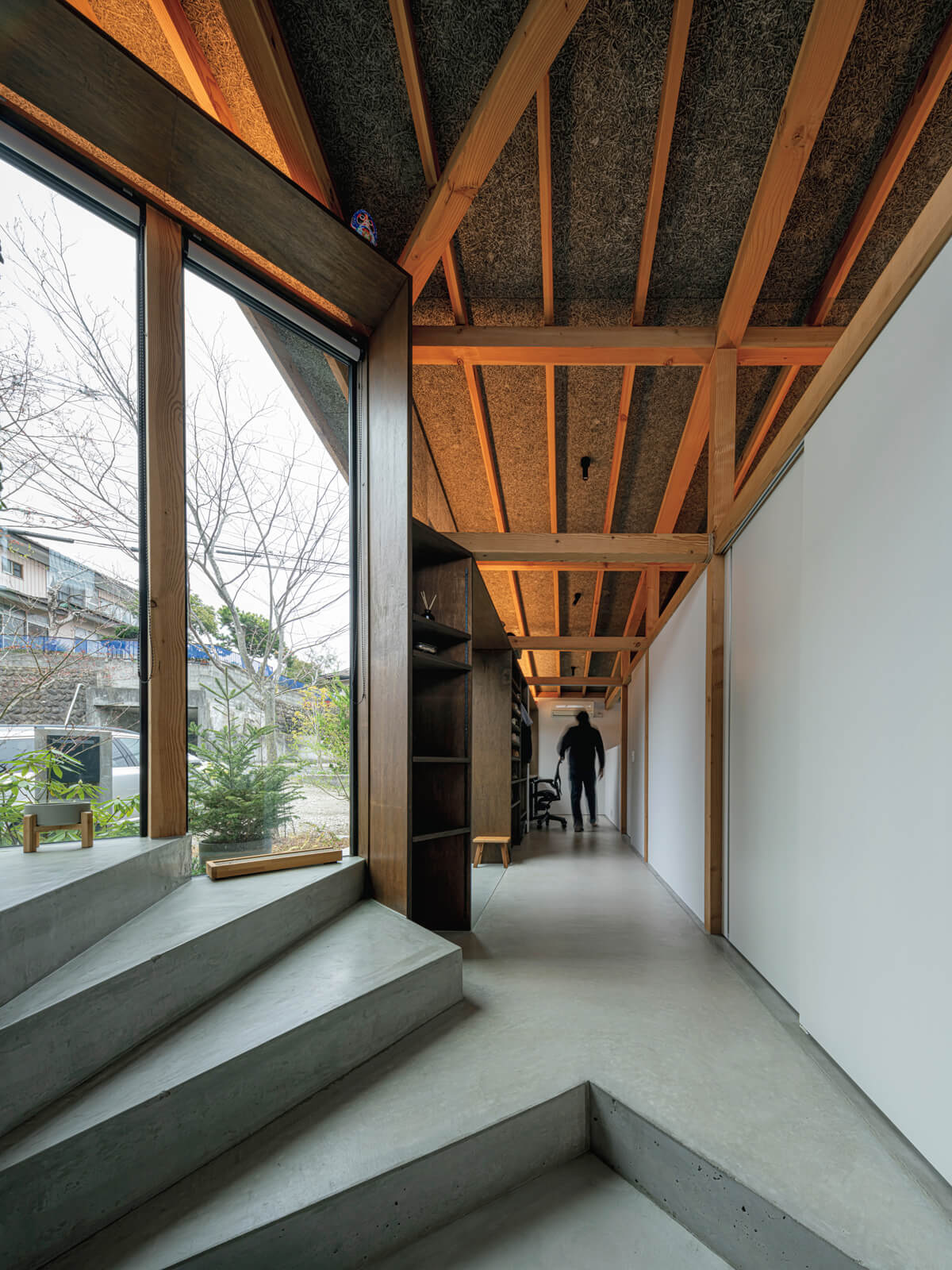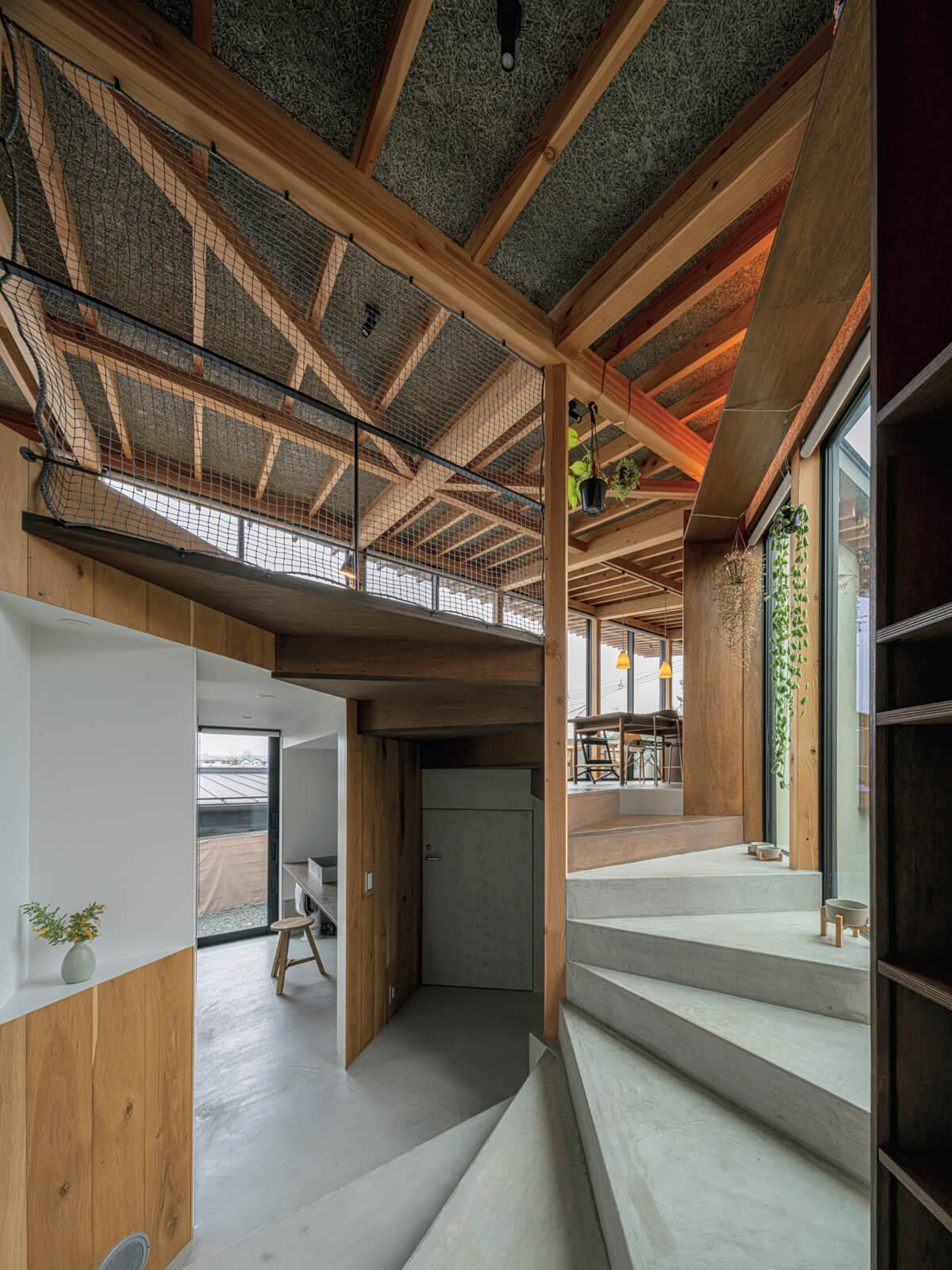「ワクワクする家を」との願いから生まれたのは、高台の眺望を楽しみながら暮らせる平屋です。敷地の高低差を生かしたスキップフロアにより、約24坪というコンパクトさからは想像できないほど伸びやかな空間が広がります。家の中心にあるらせん階段が、パノラマを堪能できるLDKとワークスペースや寝室などの静かな個室群を緩やかにゾーニング。バルコニーやLDKで刻一刻と変わる空を眺める時間は、ご夫妻にとってかけがえのない日常となりました。丹精込めて手入れする庭の緑も、暮らしに豊かな彩りを添えています。